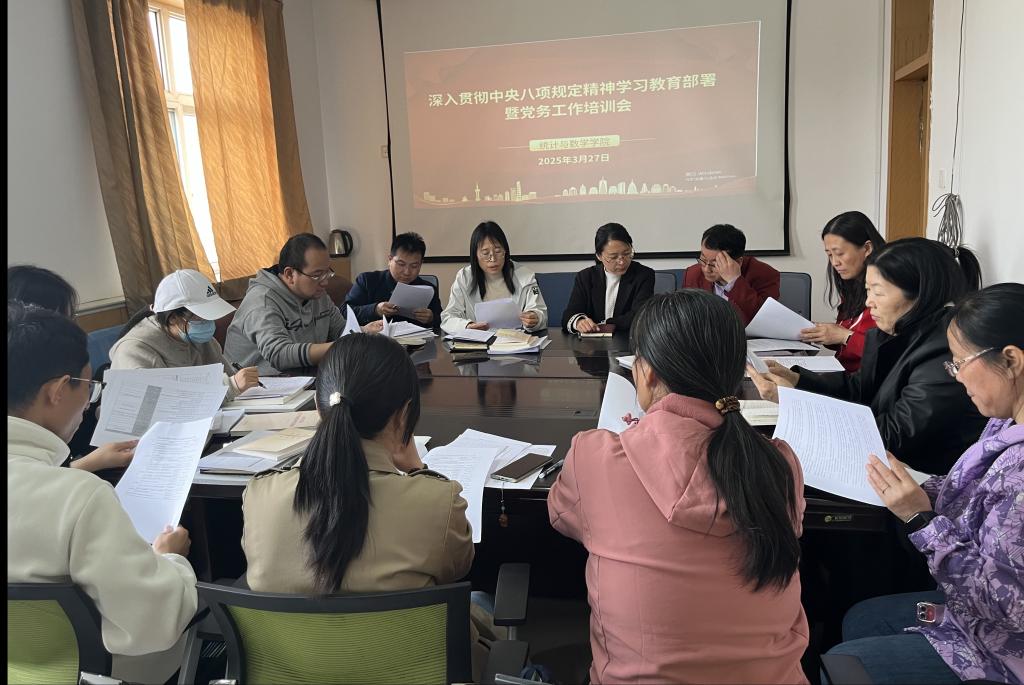 开展深入贯彻中央八项规定精神学习教育,是今年党建工作的重点任务。祃海霞传达了校党委关于开展学习教育的工作要求,结合学院实际部署了学习教育各环节的具体安排,提出“学习要有组织、学习要有成效”的基本要求和目标,强调要“学查改”全链条发力,做到三个贯穿始终,推动作风建设常态化长效化。一是要把“学深悟透”贯穿始终,通过党委理论学习中心组领学、党支部集中研学、党员个人自学等形式,强化理论武装;二是要把“深查细照”贯穿始终,聚焦师生关切,深入查摆问题;三是要把“真改实立”贯穿始终,切实将学习成果转化为推动学院高质量发展的实际成效。