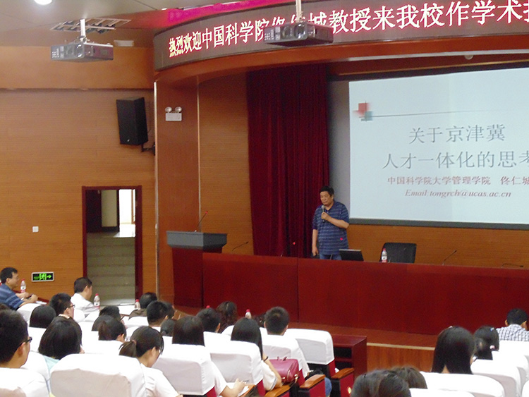 6月16日下午,应数学与统计学学院、京津冀一体化发展协同创新中心共同邀请, 中国科学院大学教授、博士生导师佟仁城在我校国际学术报告厅作了“关于京津冀人才一体化的思考”为题的报告。副校长武义青主持报告会,数学与统计学学院、京津冀一体化发展协同创新中心200余名师生听取了报告。