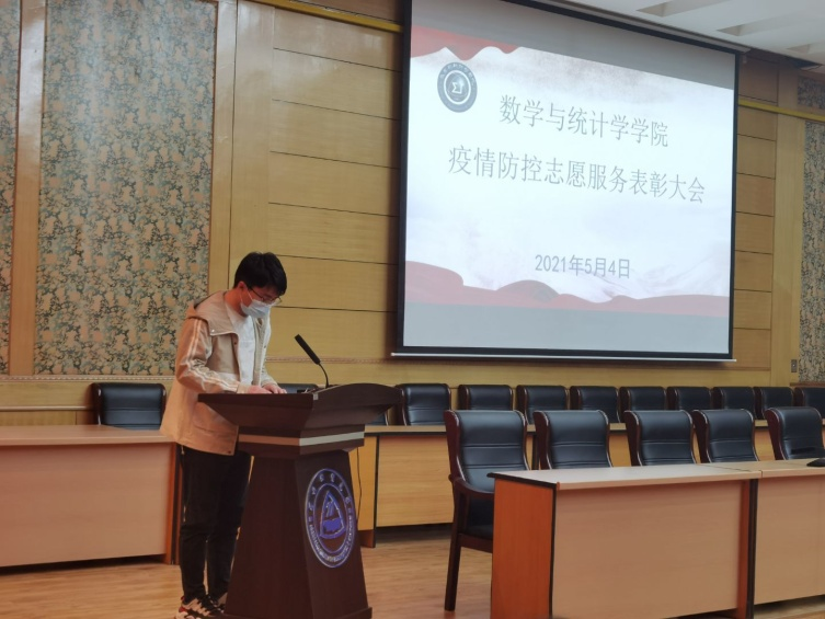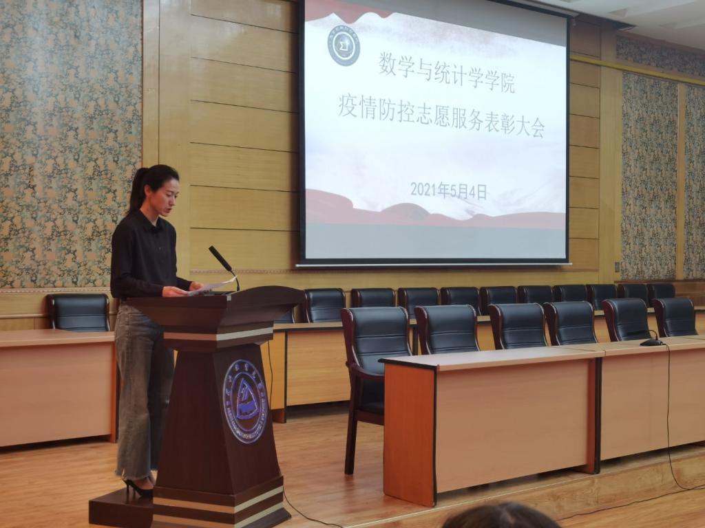 会上,祃海霞、梁建英和师生代表分别作了发言。祃海霞说到,我院长期以来秉持“求知、修德、强能、报国”的院训,积极探寻培养全面人才的新途径,学院广大师生在疫情期间积极投身志愿服务的实践,恰如其分地体现了数统人的精神风骨。梁建英提出,我院师生在疫情期间展现出的新时代青年风貌令人印象深刻,借此次表彰大会,为参与疫情防控志愿服务的师生由衷点赞。