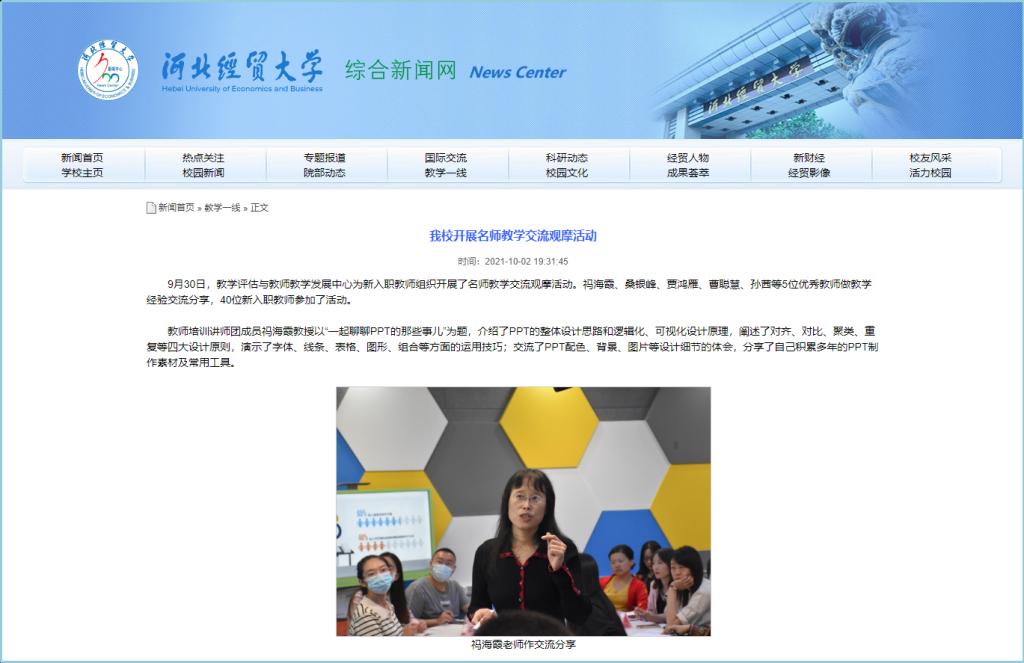 2021年9月30日,教学评估与教师教学发展中心组织开展了名师教学交流观摩活动。校教师培训讲师团成员、数学与统计学学院祃海霞教授应邀做交流分享,40位新入职教师参加了活动。