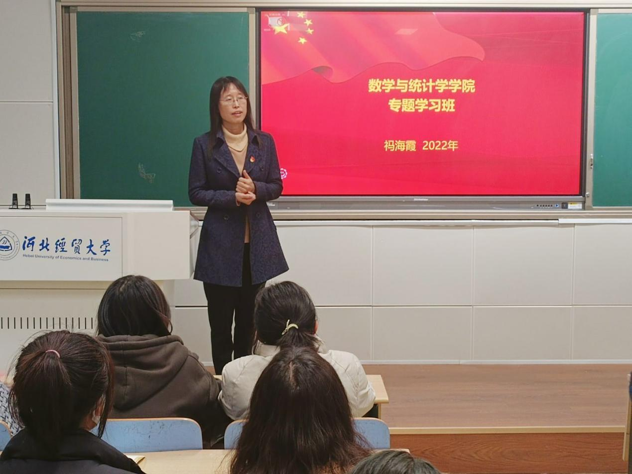 3月24日晚七点,数学与统计学学院团委于北三教A202开展以“庆祝建团一百周年、喜迎党的二十大”为主题的团日活动。此次活动特邀学院党委书记祃海霞教授为我院同学做专题党课辅导讲座,团委书记王洋老师和各班团员代表参加。