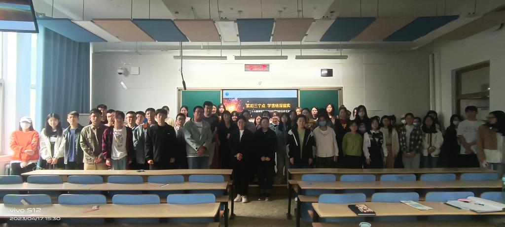 祃海霞以《紧扣三个点,学透悟深做实——贯彻二十大精神学习习近平新时代中国特色社会主义思想》为题,以党的二十大精神解读为主线,以学习贯彻习近平新时代中国特色社会主义思想主题教育、大兴调查研究为重点,在对二十大报告进行8方面解读的基础上,紧扣习近平新时代中国特色社会主义思想、中国式现代化、发挥学科专业优势大兴调研实践3个点,利用详实的数据资料和生动形象的多媒体课件,向同学们展示了新时代十年的建设成就、使命任务,解读了中国式现代化的深刻内涵以及三个全面、三个务必、五个必由之路的核心要义。