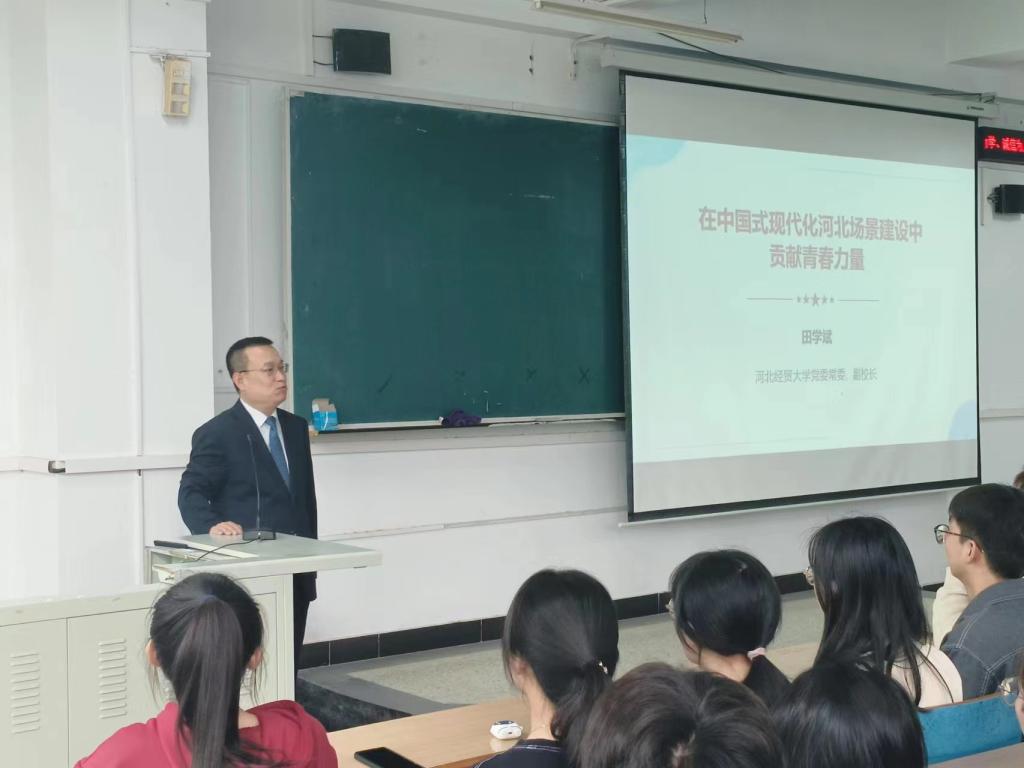 田学斌以《在中国式现代化河北场景建设中贡献青春力量》为题,从理解中国式现代化河北场景、在河北高质量发展中贡献青春力量两个方面,通过详实的数据分析,系统解读了什么是现代化、什么是中国式现代化,以及如何准确把握河北发展的条件环境、深入谋划推进中国式现代化河北场景、加快建设经济强省美丽河北等问题,希望经贸学子努力学习科学文化知识,扎实提高自身专业技能,以实际行动参与到中国式现代化河北场景建设中去,为美丽中国、美丽河北贡献聪明才智和青春力量。