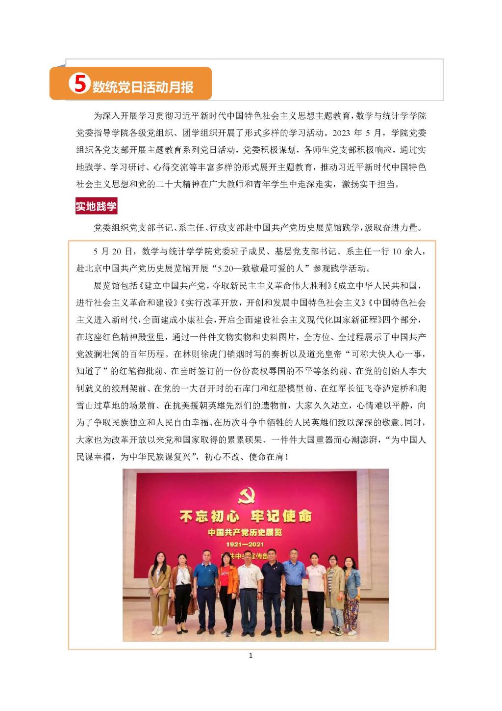 为深入开展学习贯彻习近平新时代中国特色社会主义思想主题教育,数学与统计学学院党委指导学院各级党组织、团学组织开展了形式多样的学习活动。2023年5月,学院党委组织各党支部开展主题教育系列党日活动,党委积极谋划,各师生党支部积极响应,通过实地践学、学习研讨、心得交流等丰富多样的形式展开主题教育,推动习近平新时代中国特色社会主义思想和党的二十大精神在广大教师和青年学生中走深走实,激扬实干担当。