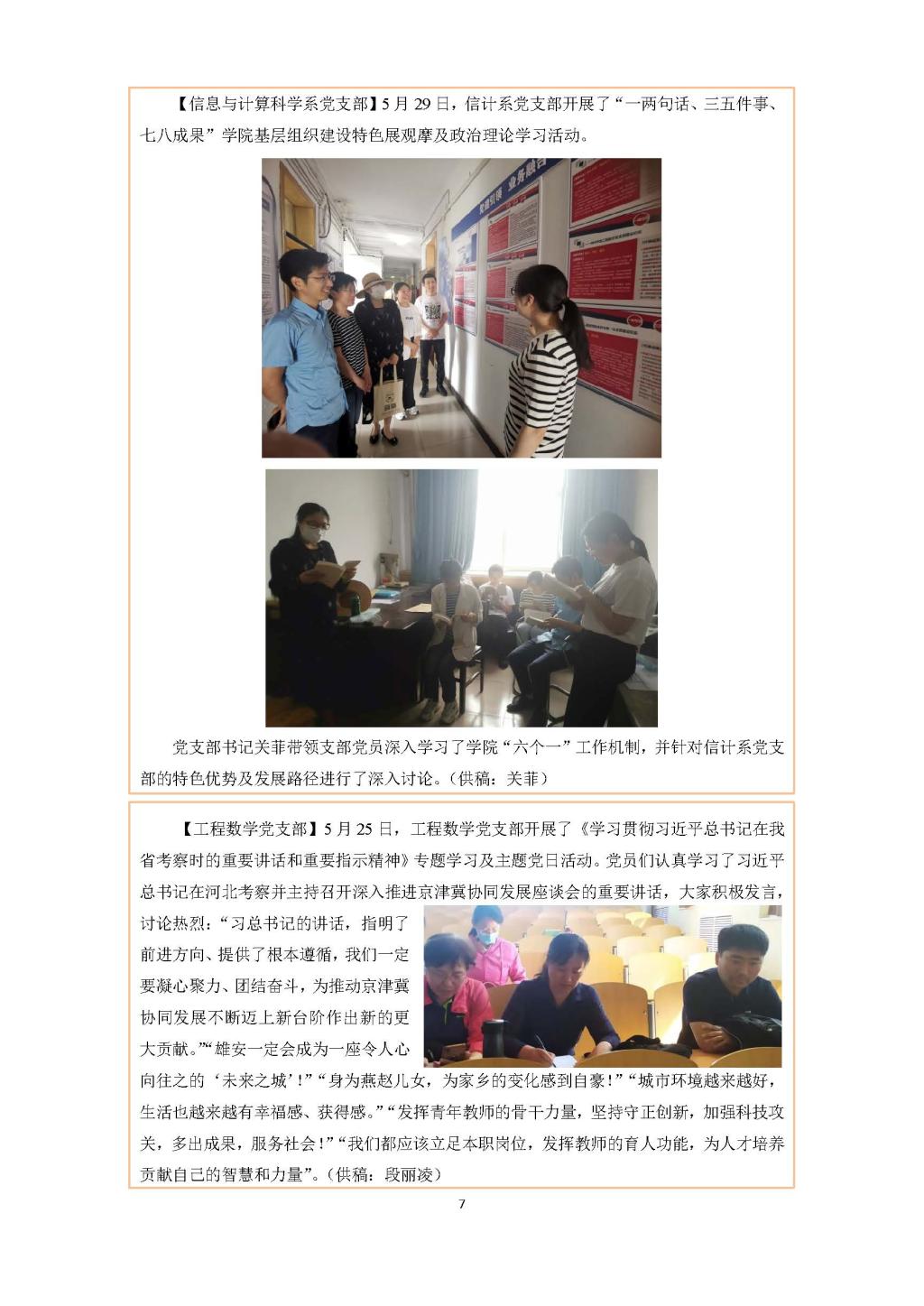 【工程数学党支部】5月25日,工程数学党支部开展了《学习贯彻习近平总书记在我省考察时的重要讲话和重要指示精神》专题学习及主题党日活动。党员们认真学习了习近平总书记在河北考察并主持召开深入推进京津冀协同发展座谈会的重要讲话,大家积极发言,讨论热烈:“习近平总书记的讲话,指明了前进方向、提供了根本遵循,我们一定要凝心聚力、团结奋斗,为推动京津冀协同发展不断迈上新台阶作出新的更大贡献。”“雄安一定会成为一座令人心向往之的‘未来之城’!”“身为燕赵儿女,为家乡的变化感到自豪!”“城市环境越来越好,生活也越来越有幸福感、获得感。”“发挥青年教师的骨干力量,坚持守正创新,加强科技攻关,多出成果,服务社会!”“我们都应该立足本职岗位,发挥教师的育人功能,为人才培养贡献自己的智慧和力量”。(供稿:段丽凌)