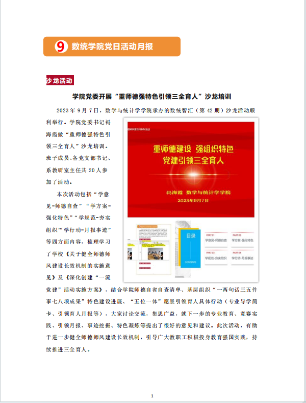 2023年9月7日,数学与统计学学院承办的数统智汇(第42期)沙龙活动顺利举行。学院党委书记祃海霞做“重师德强特色引领三全育人”沙龙培训。班子成员、各党支部书记、系教研室主任共20人参加了活动。