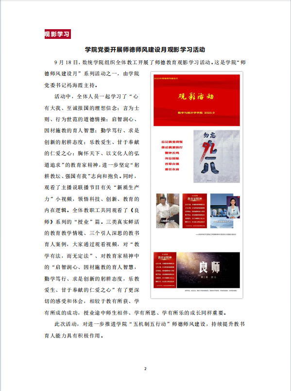 9月18日,数统学院组织全体教工开展了师德教育观影学习活动。这是学院“师德师风建设月”系列活动之一,由学院党委书记祃海霞主持。