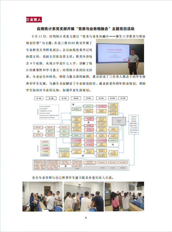 9月11日,应用统计系党支部以“党务与业务相融合——新生入学教育与职业规划引领”为主题,在北三教B102教室开展了专业教育及导师见面会。会议由院党委书记祃海霞主持,系副主任张良勇主讲。教育内容包含9个板块,从统计学是什么入手,讲解了统计的重要性和学习意义、应用统计系的历史沿革、专业定位和特色、师资力量及课程地图,重点讲述了三全育人理念下的学生培养和学生发展,为新生全面解读了专业修读路径、就业前景和四年职业规划,帮助学生加深对专业的认知,加强学业生涯规划。