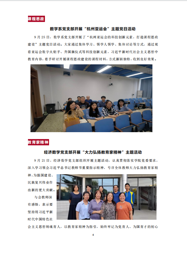 9月21日,经济数学党支部组织开展主题活动,认真贯彻落实学院党委要求,深入学习领会习近平总书记教师节重要指示精神,号召全体教师大力弘扬教育家精神,为强国建设、民族复兴伟业作出新的更大贡献。