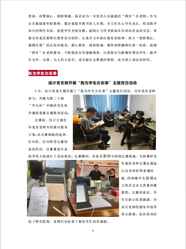 9月,信计系党支部开展了“我为学生办实事”主题党日活动,全体党员老师参与,开展为第二十届“华为杯”中国研究生数学建模竞赛志愿服务活动。