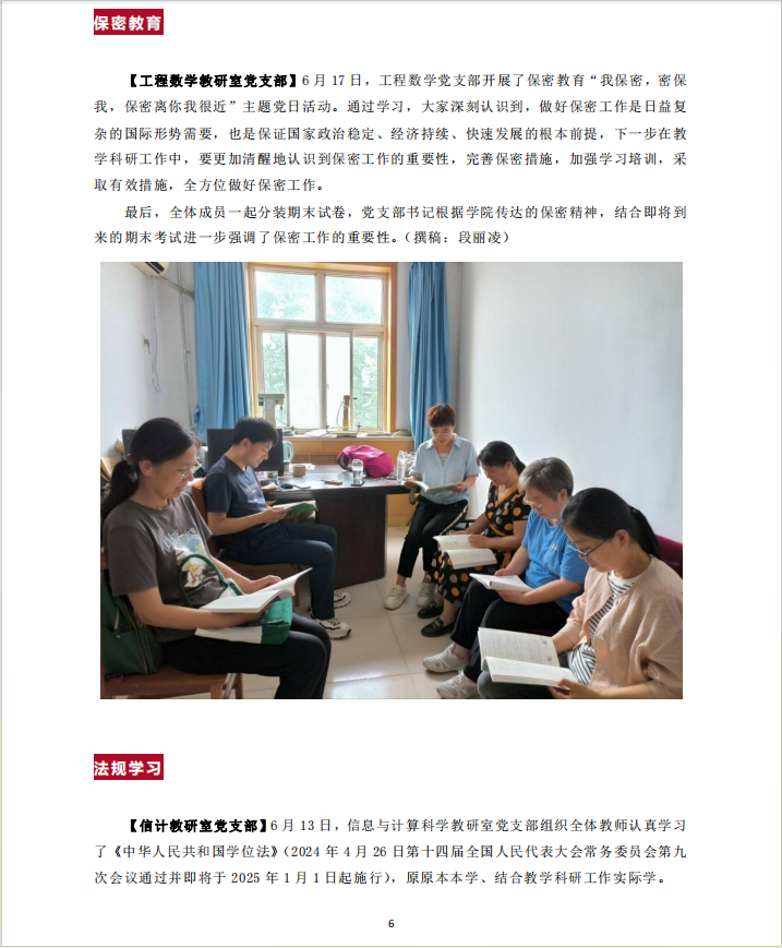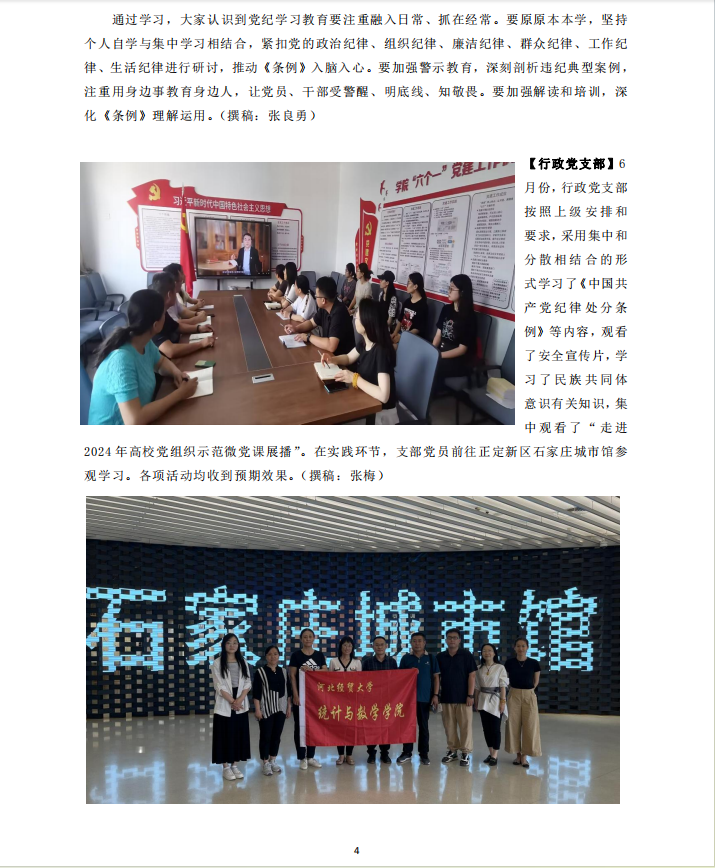 【行政党支部】6月份,行政党支部按照上级安排和要求,采用集中和分散相结合的形式学习了《中国共产党纪律处分条例》等内容,观看了安全宣传片,学习了民族共同体意识有关知识,集中观看了“走进2024年高校党组织示范微党课展播”。在实践环节,支部党员前往正定新区石家庄城市馆参观学习。各项活动均收到预期效果。(撰稿:张梅)