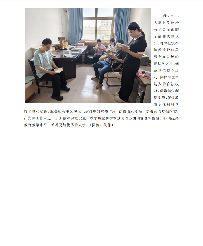 通过学习,大家对学位法有了更全面的了解和深刻认知,对学位法在培养德智体美劳全面发展的高层次人才、规范学位授予活动、保护学位申请人的合法权益、保障学位制度实施、促进教育文化和科学技术事业发展、服务社会主义现代化建设中的重要作用,纷纷表示今后一定要认真贯彻落实,在实际工作中进一步加强对课程设置、教学质量和学术规范等方面的管理和监督,推动提高教育教学水平,培养更加优秀的人才。(撰稿:关菲)
