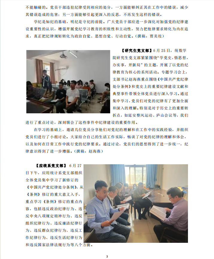 【应统系党支部】6月27日下午,应用统计系党支部组织全体党员集中学习了新修订的《中国共产党纪律处分条例》,从《条例》修订的重大意义入手,重点学习《条例》修订的重点内容,包括违反政治纪律行为、违反中央八项规定精神行为、违反组织纪律行为、违反廉洁纪律行为、违反群众纪律行为、违反工作纪律行为、违反生活纪律行为和违反国家法律法规行为等八个方面。
