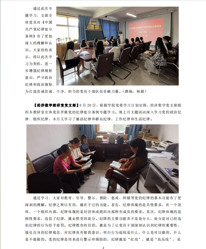 【经济数学教研室党支部】6月20日,根据学院党委学习计划安排,经济数学党支部组织本教研室全体党员开展党的纪律处分条例专题学习。继上月主题活动深入学习党的政治纪律、组织纪律,本月又学习了廉洁纪律和群众纪律,工作纪律和生活纪律。