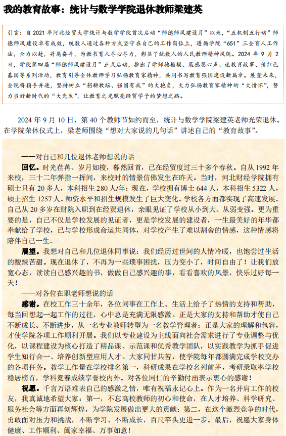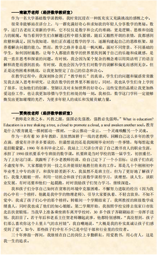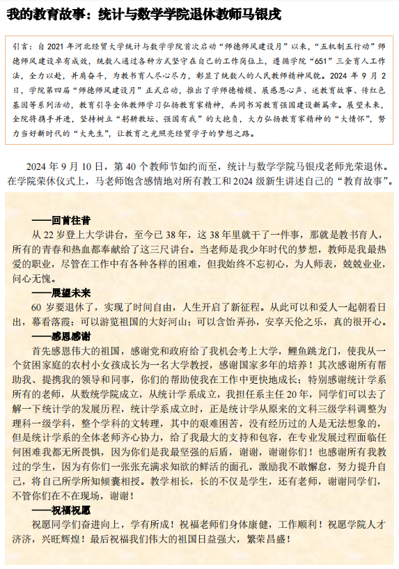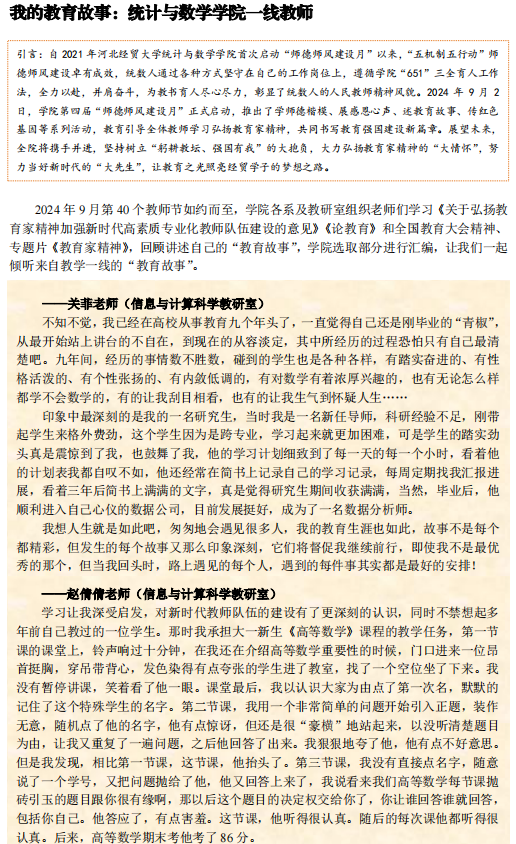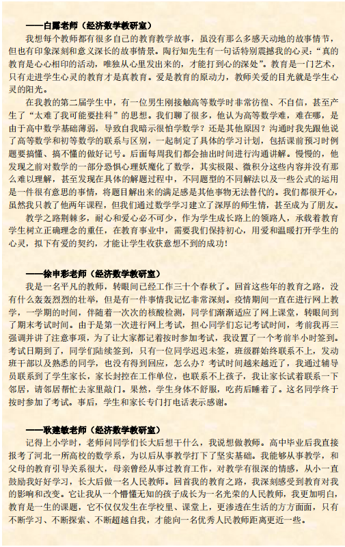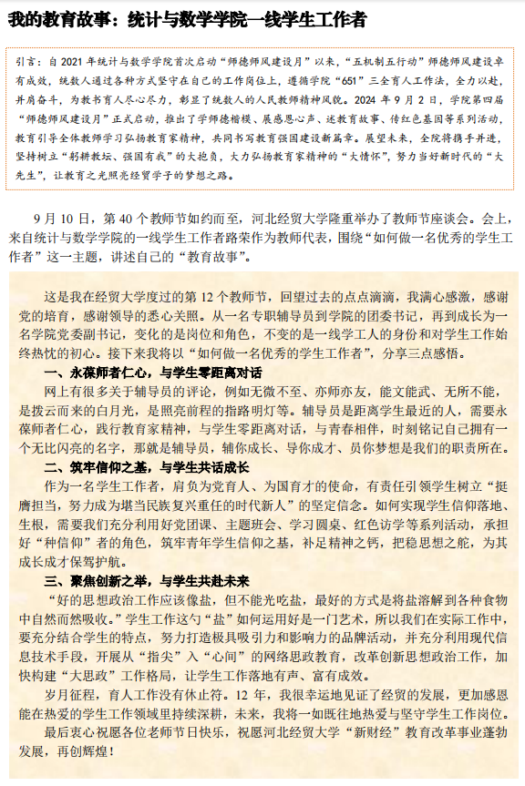 自2021年太阳成集团tyc33455ccww首次启动“师德师风建设月”以来,“五机制五行动”师德师风建设卓有成效,统数人通过各种方式坚守在自己的工作岗位上,遵循学院“651”三全育人工作法,全力以赴,并肩奋斗,为教书育人尽心尽力,彰显了统数人的人民教师精神风貌。2024年9月2日,学院第四届“师德师风建设月”正式启动,推出了学师德楷模、展感恩心声、述教育故事、传红色基因等系列活动,教育引导全体教师学习弘扬教育家精神,共同书写教育强国建设新篇章。展望未来,全院将携手并进,坚持树立“躬耕教坛、强国有我”的大抱负,大力弘扬教育家精神的“大情怀”,努力当好新时代的“大先生”,让教育之光照亮经贸学子的梦想之路。