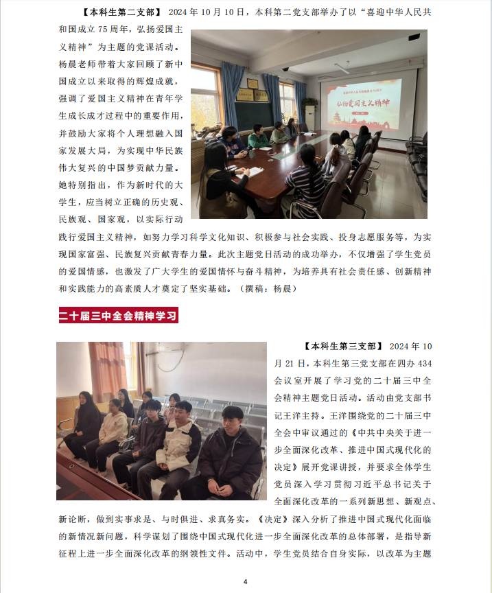 【本科生第三支部】2024年10月21日,本科生第三党支部在四办434会议室开展了学习党的二十届三中全会精神主题党日活动。活动由党支部书记王洋主持。王洋围绕党的二十届三中全会中审议通过的《中共中央关于进一步全面深化改革、推进中国式现代化的决定》展开党课讲授,并要求全体学生党员深入学习贯彻习近平总书记关于全面深化改革的一系列新思想、新观点、新论断,做到实事求是、与时俱进、求真务实。《决定》深入分析了推进中国式现代化面临的新情况新问题,科学谋划了围绕中国式现代化进一步全面深化改革的总体部署,是指导新征程上进一步全面深化改革的纲领性文件。活动中,学生党员结合自身实际,以改革为主题展开了讨论,交流了学习体会和未来设想,纷纷表示将进一步加强政治理论学习,不断提高党性修养,为社会主义现代化建设贡献自己的力量。(撰稿:王洋)