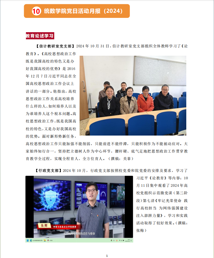 【行政党支部】2024年10月,行政党支部按照校党委和院党委的安排及要求,学习了习近平《论教育》等内容;10月11日集中观看了2024年高校党组织示范微党课(第二阶段)第七讲《牢记光荣使命 践行高校担当 为网络强国建设注入澎湃力量》,学习和实践活动取得了较好效果。(撰稿:张梅)