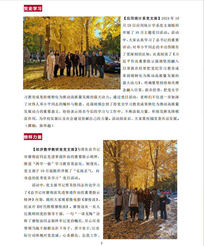 【应用统计系党支部】2024年10月28日应用统计学系党支部组织开展了10月主题党日活动。活动中,大家认真学习了总书记的重要讲话,对邓小平同志的丰功伟绩有了更深刻的认知;认真阅读了《习近平作出重要指示强调坚持融入日常抓在经常把党纪学习教育成果持续转化为推动高质量发展的强大动力》,明确要坚持将相关理念融入日常、抓在经常,把党史学习教育成果持续转化为推动高质量发展的强大动力。通过党日活动,老师们不仅进一步加深了对伟人邓小平同志的缅怀与敬意,还深刻领会到了将党史学习教育成果转化为推动高质量发展动力的重要意义,纷纷表示将在今后的学习与工作中,不断汲取力量,积极发挥先锋模范作用,为学校发展以及社会建设贡献自己的力量。活动结束后,大家赏校园美景共话发展。(撰稿:陈华超)