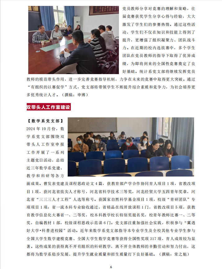 【数学系党支部】2024年10月份,数学系党支部围绕双带头人工作室申报工作开展了一系列主题党日活动,总结近三年数学系党建、教学和科研等各方面成果。曾发表党建及课程思政论文4篇,获教育部产学合作协同育人项目1项,省教改项目1项,获河北省拔尖人才称号,河北省科学技术三等奖,tyc33455cc太阳成集团五四青年奖章,河北省“三三三人才工程”人选等称号。获国家自然科学基金项目1项,校级“青研团队”专项项目1项;省一流本科专业验收通过,省精品在线开放课程1门,省教改项目5项,获教育教学信息化大赛省一、二等奖,校本科教学校长特别奖提名奖,校青年教师比赛一、二等奖,自编教材1部,校级课程思政示范课6门。党支部注重加强社会实践,积极参与“冀遇好大学•科普进校园”活动。近年来数学系党支部指导本专业学生及全校其他专业学生参与全国大学生数学建模竞赛、全国大学生数学竞赛等获得全国性奖项317项,育人成效较为显著。这些成果的获得离不开有组织的科研教学,离不开全体教师的辛勤劳动和努力付出,这都将为数学系稳步发展、提升学生就业质量和招生质量打下良好基础。(撰稿:常之魁)
