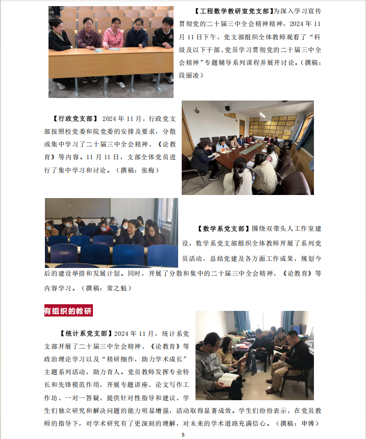 【行政党支部】2024年11月,行政党支部按照校党委和院党委的安排及要求,分散或集中学习了二十届三中全会精神、《论教育》等内容。11月11日,支部全体党员进行了集中学习和讨论。(撰稿:张梅)