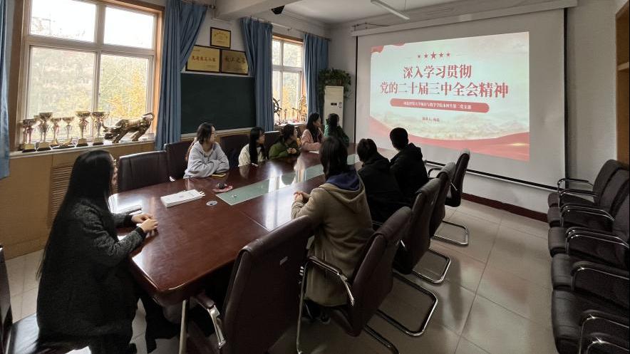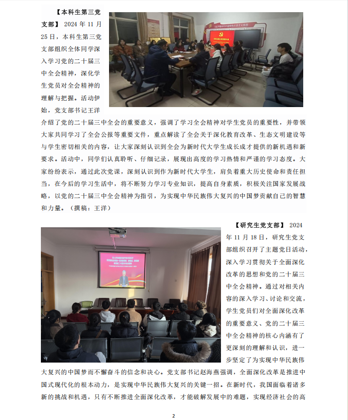 【本科生第三党支部】2024年11月25日,本科生第三党支部组织全体同学深入学习党的二十届三中全会精神,深化学生党员对全会精神的理解与把握。活动伊始,党支部书记王洋介绍了党的二十届三中全会的重要意义,强调了学习全会精神对学生党员的重要性,并带领大家共同学习了全会公报等重要文件,重点解读了全会关于深化教育改革、生态文明建设等与学生密切相关的内容,让大家深刻认识到全会为新时代大学生成长成才提供的新机遇和新要求。活动中,同学们认真聆听、仔细记录,展现出高度的学习热情和严谨的学习态度。大家纷纷表示,通过此次党课,深刻认识到作为新时代大学生,肩负着重大历史使命和责任担当,在今后的学习生活中,将不断努力学习专业知识,提高自身素质,积极关注国家发展战略,以党的二十届三中全会精神为指引,为实现中华民族伟大复兴的中国梦贡献自己的智慧和力量。(撰稿:王洋)