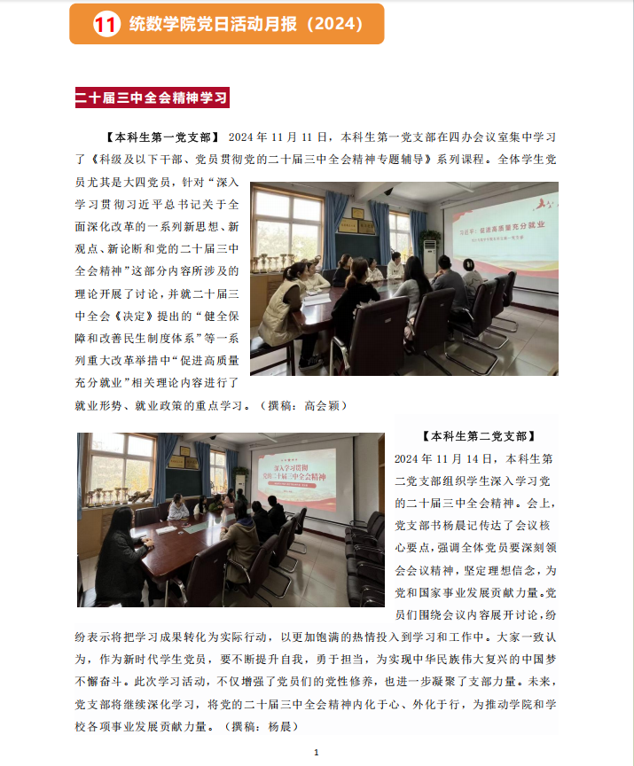 【本科生第一党支部】2024年11月11日,本科生第一党支部在四办会议室集中学习了《科级及以下干部、党员贯彻党的二十届三中全会精神专题辅导》系列课程。全体学生党员尤其是大四党员,针对“深入学习贯彻习近平总书记关于全面深化改革的一系列新思想、新观点、新论断和党的二十届三中全会精神”这部分内容所涉及的理论开展了讨论,并就二十届三中全会《决定》提出的“健全保障和改善民生制度体系”等一系列重大改革举措中“促进高质量充分就业”相关理论内容进行了就业形势、就业政策的重点学习。(撰稿:高会颖)