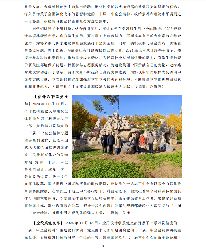 【统计系党支部】2024年11月,统计系党支部开展了二十届三中全会精神、《论教育》等政治理论学习以及“精研细作,助力学术成长”主题系列活动,助力育人。党员教师发挥专业特长和先锋模范作用,开展专题讲座、论文写作工作坊、一对一答疑,提供针对性指导和建议,学生们独立研究和解决问题的能力明显增强,活动取得显著成效。学生们纷纷表示,在党员教师的指导下,对学术研究有了更深刻的理解,对未来的学术道路充满信心。(撰稿:申博)