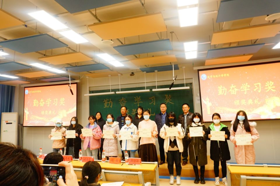 首先,耿会清宣读数学与统计学学院2021年度勤奋学习奖表彰的决定。随后,高会颖宣布各组获奖名单,由各位领导亲自为同学们颁发奖状和奖品,并与他们进行拍照合影。最后,高会颖老师对本次活动进行了总结,她指出:学习知识是高校的核心内容,也是我校最重视的要点。作为一名学生,只有不断地勤奋学习,才能有做作为,有所建树,在往后的人生中拥有选择的权利。知识是树立核心价值观的重要基础。为学之要贵在勤奋、贵在钻研、贵在有恒,择其精要,努力做到又博又专、愈博愈专。