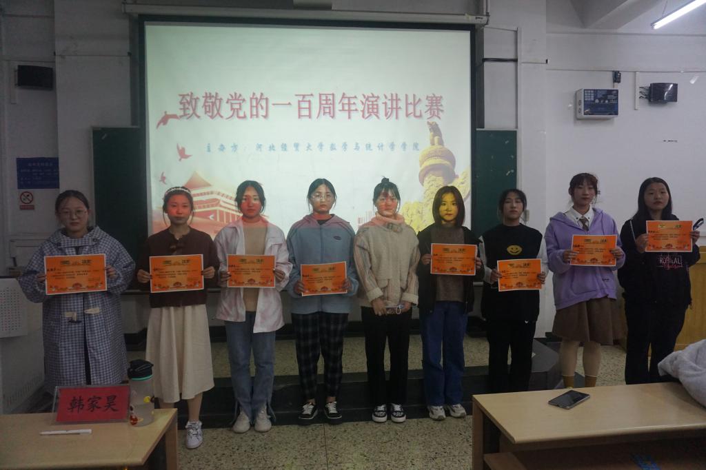 10月19日晚7点,数学与统计学学院于北三教B401举办了“致敬党的一百周年”主题演讲比赛,评委由学院学生会干部担任,大一、大二学生代表参加。