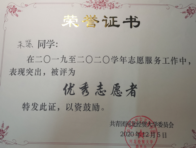 朱紫同学曾担任院学生会就创部部长,表现突出,曾荣获“国家励志奖学金”“校级三好学生”“校级优秀团员”“校级优秀志愿者”等荣誉,获得过2021年“挑战杯”河北省大学生课外学术科技作品竞赛红色专项活动省级特等奖、第十一届全国大学生市场调查分析大赛省级二等奖。她乐于奉献,参与多次抗疫志愿服务,被唐山市曹妃甸区授予“曹妃甸区优秀青年志愿者”“优秀抗疫志愿者”等称号。