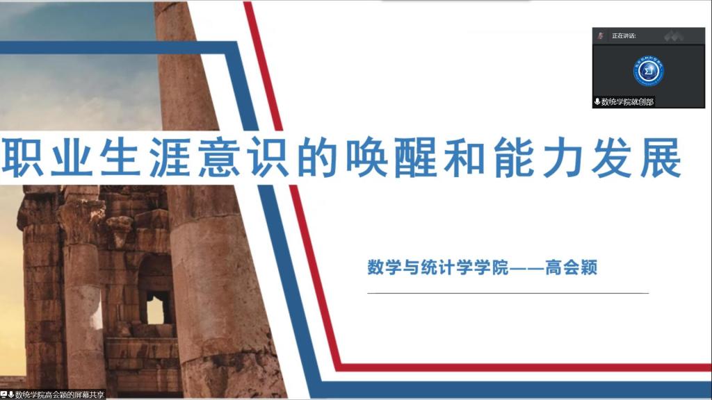 为了帮助同学们更好的规划自己的职业生涯,持续深化“我为同学做件事”实践活动,4月15号晚七点,数统学院团委联合就创部举办了主题为“职场扬帆 逐梦启航”线上就业指导讲座。本次讲座主讲人有院学工办主任、19级辅导员高会颖老师,18级统计二班陈晓英同学和19级应数一班王洋同学。