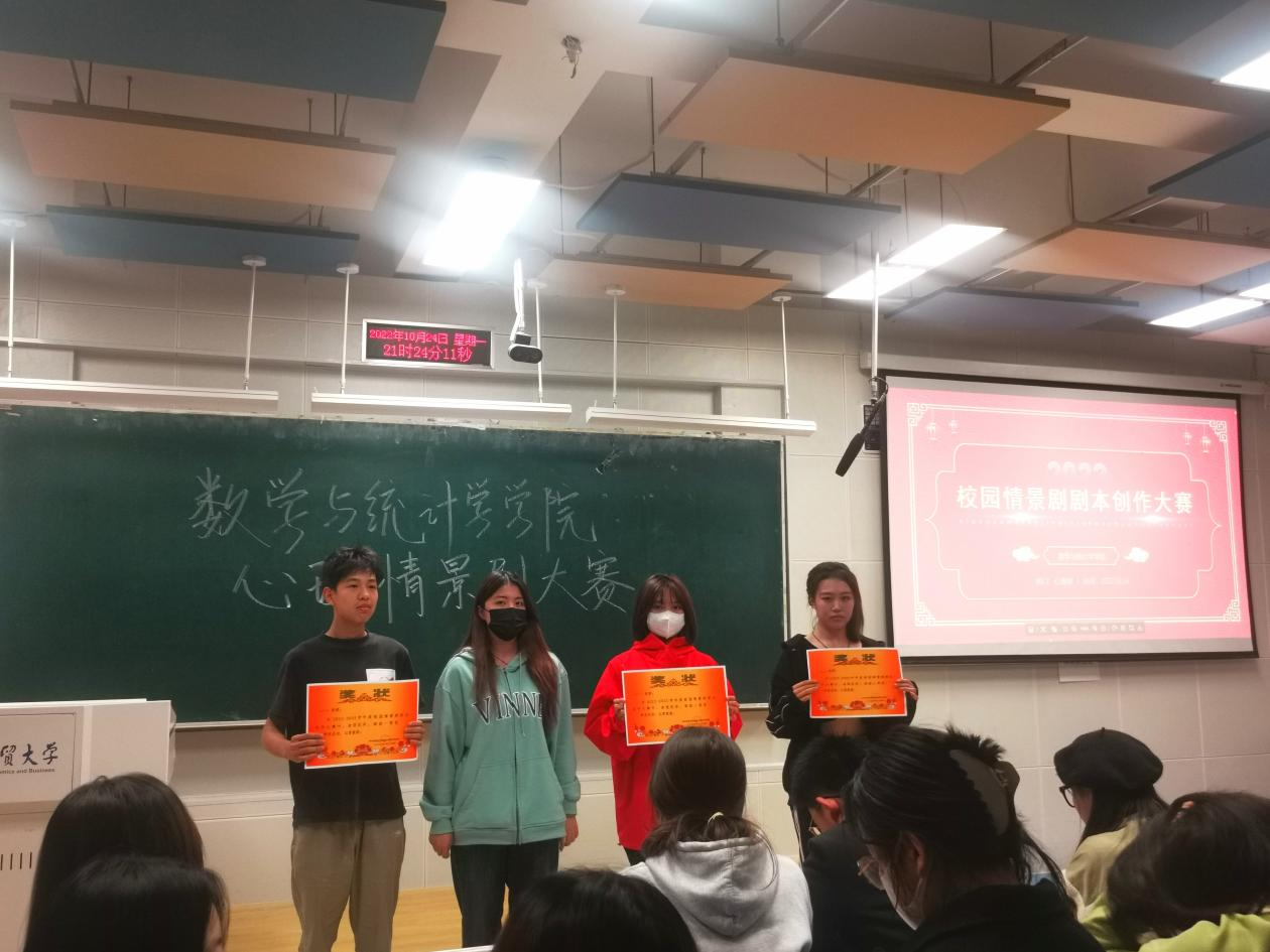 首先,王洋老师作开场讲话,他指出:心理剧创作大赛一直是学院的传统活动之一,在历届大赛的基础上,本次心理剧剧本创作大赛活动进行了创新与丰富。希望通过心理情景剧剧本的创作和征集,将同学们重点关注的一些心理矛盾冲突集中反映出来,从而更好地帮助同学们正确对待、有效解决相应的心理困惑,同时也能加强团队协作意识,激发同学的创作能力,能够使同学们认识自我、真诚待人。接着,院舞蹈队登场为大赛活跃气氛,各班参赛队伍相继登场。大家准备充分,立足点各有侧重,剧本内容丰富多彩,切实还原了校园生活中大学生的心理困惑,带给同学们温情与思考。最后,经过一番激烈角逐,2022级数学二班“不被定义的我们”获得一等奖;2022级统计一班“玫瑰少年”获得二等奖;2022级统计三班“永葆初心本色”获得三等奖,评委依次为获得名次的团队颁发荣誉证书并给予充分肯定。