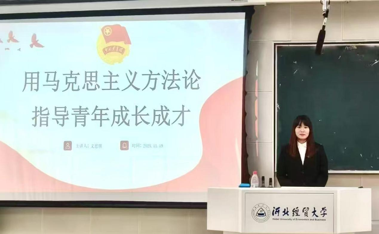 在第五课《用马克思主义方法论指导青年成长成才》中,团委实践竞赛部部长文思琪深入阐述了马克思主义的核心内涵和伟大意义,使同学们明白马克思主义是科学的世界观和方法论,是认识世界、改造世界的强大思想武器。希望同学们以更加科学的思维、更加饱满的热情,在新时代展现青年担当,贡献青春力量。