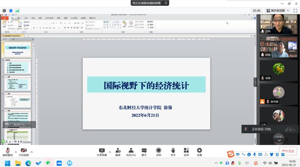 6月21日下午,数学与统计学学院邀请东北财经大学博士生导师徐强教授在腾讯会议平台作题为《国际视野下的经济统计》的学术报告。报告由数学与统计学学院副院长闫亮主持,70余名教师和学生参加会议。