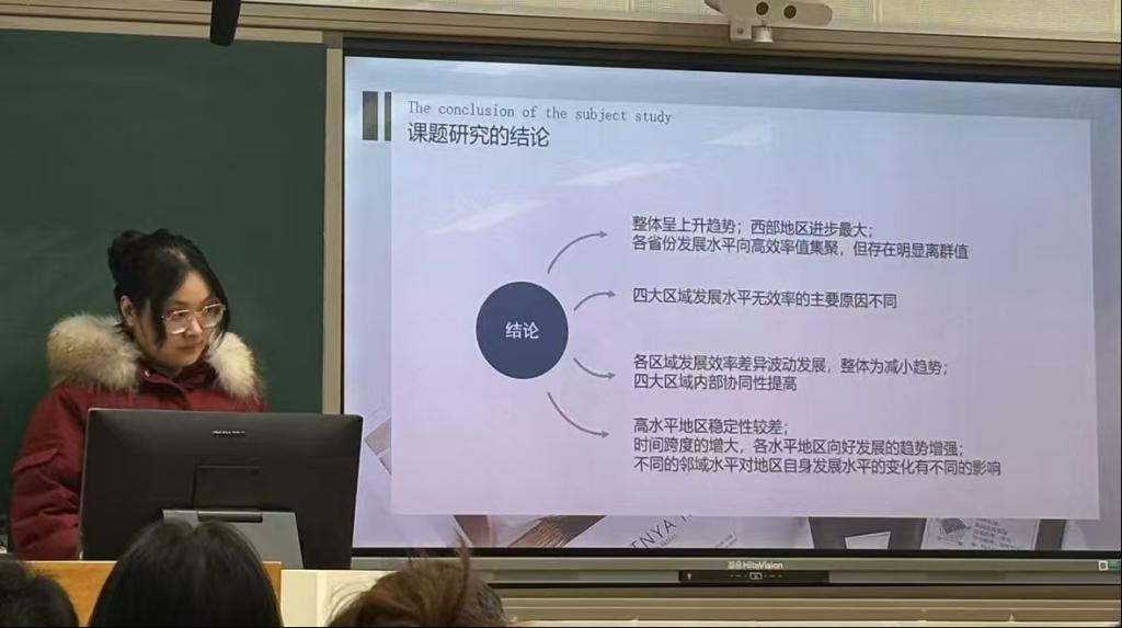 2023级应用统计专业优秀研究生叶盼盼发表报告。报告主题为“农业新质生产力发展效率的测度、区域差异及动态演进”。她指出,各省份的农业发展水平正逐渐向高效率值靠拢,显示出农业生产力的提升趋势。她的研究不仅揭示了农业新质生产力的发展趋势,也为理解地区间发展差异提供了新的视角,并为制定更加精准的农业发展政策提供了科学依据。