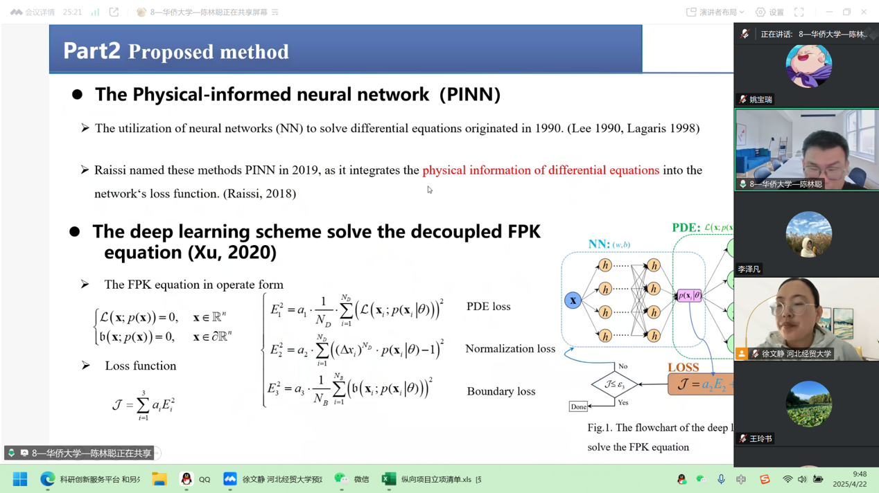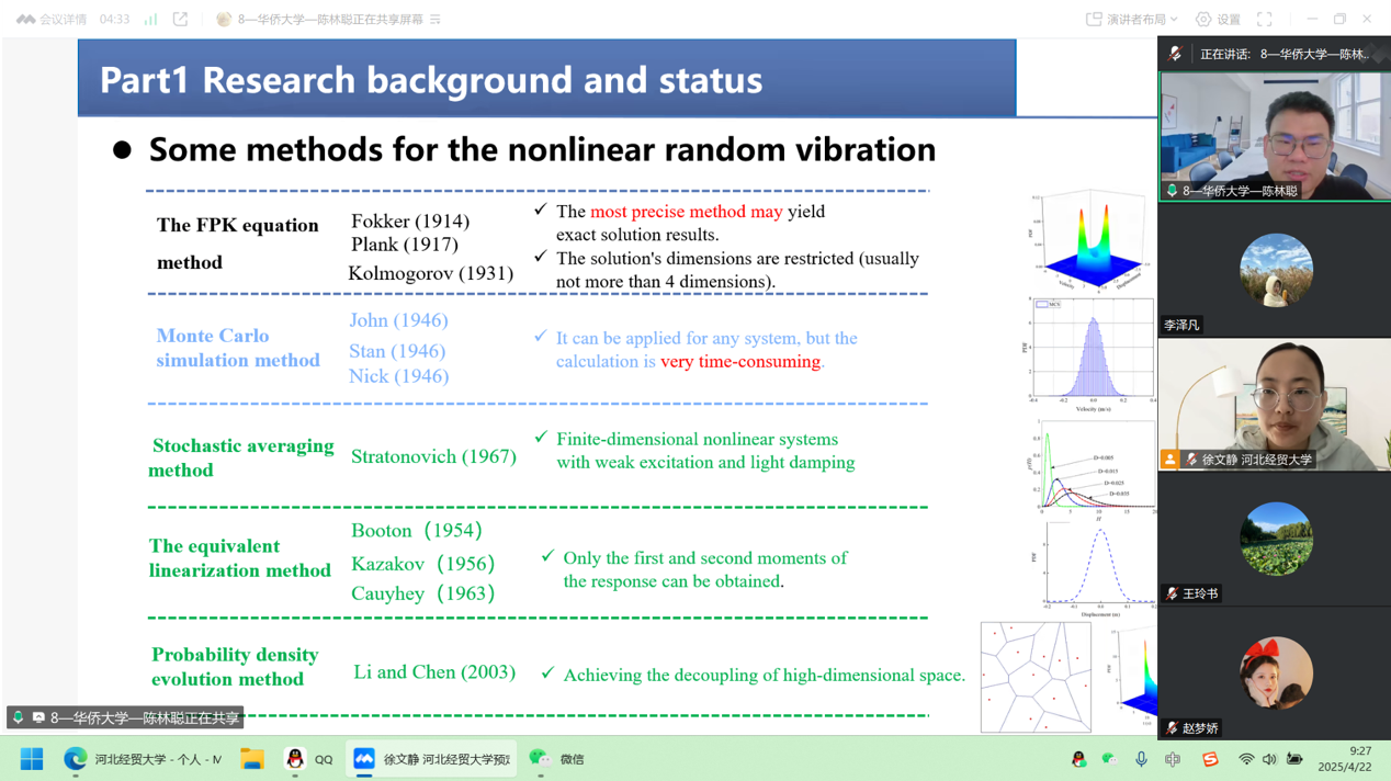 4月22日上午,华侨大学陈林聪教授应太阳成集团tyc33455ccww邀请线上作题为“一种高斯白噪声下求解强非线性系统高维FPK方程的高效方法”的学术报告,相关专业师生20余人参会。