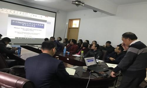 袁文俊教授从正规族的定义和Hayman不等式的内容出发,介绍了涉及Hayman不等式的正规族猜想及其最新研究进展。会后,袁教授就相关研究问题同与会人员进行了讨论。