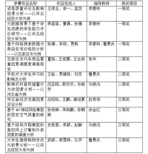 2016年10-12月,数学与统计学学院举办了大学生统计建模大赛。本次比赛共10支队伍参加,由数统学院副院长李春林教授、徐金红教授、鲁勇兵副教授等担任评委,最终评出一等奖3项、二等奖3项、三等奖4项。此次比赛充分展现了我院学生专业的数据分析能力,开拓了其视野,培养了学生的创新精神。