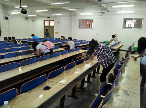 活动前期准备阶段,志愿服务队对全院同学进行了广泛动员,并采购了酒精,小刀等清洁用品,随后,负责人向大家具体介绍了如何除去桌面上的贴纸、污渍,如何对教室环境卫生进行清扫等工作技巧。在负责人的帮助下,数统学院志愿者服务队的同学们很快投入到工作中,同学们以小组的形式,耐心地对宿舍课桌的桌面和教室的地面进行清理。服务队同学积极的工作态度、高效的工作效率和高度的个人素质得到了楼管的一致好评。同学们纷纷表示,干净的教室环境会使同学们学习心情舒畅,让同学们充分体会到工作人员打扫教室的辛苦,今后不但自己要做爱护教室环境的实践者,也会向身边的其他同学宣传,大家一起维护干净整洁的教室环境,为构建和谐文明校园添砖加瓦,为迎接教学评估奉献自己的一份力量。
