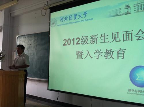 更好了解和适应大学生活,更直接掌握专业教学特色及学科发展前景等知识,同时也为增强大一新生与学院领导老师之间的交流,培养学生学院认同感,数统学院积极响应学校号召,于9月22日在我校B教201教室举行了“青春激昂梦想起航”——数统学院2014级新生入学教育活动。院党总支书记靳国良,党总支副书记赵春果,院长赵秀恒教授等院领导出席了见面会。学院各职能部门负责人、辅导员以及2014级本科生全体新生参加见面会。开学典礼由党总支副书记赵春果主持。