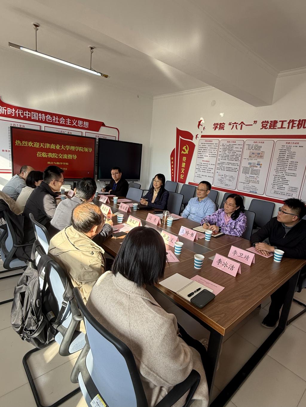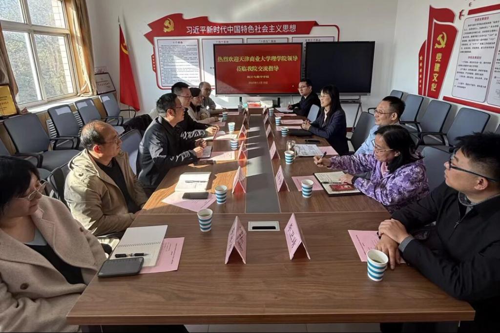 11月19日,天津商业大学理学院党委副书记、院长唐文广带领副院长李晶洁,统计系党支部书记、系主任卢志义,计算与金融数学党支部书记、系主任李景焕,统计系副主任刘兆阳,办公室党支部书记、教学办公室主任李冰洁一行到访我院。学院党委书记祃海霞,院长闫亮,党委副书记路荣,副院长王玲书、张良勇,统计系党支部书记、系主任李卫靖与到访嘉宾围绕党建品牌创建、党建与业务融合、学科建设与教育教学改革开展等进行了专题交流座谈。