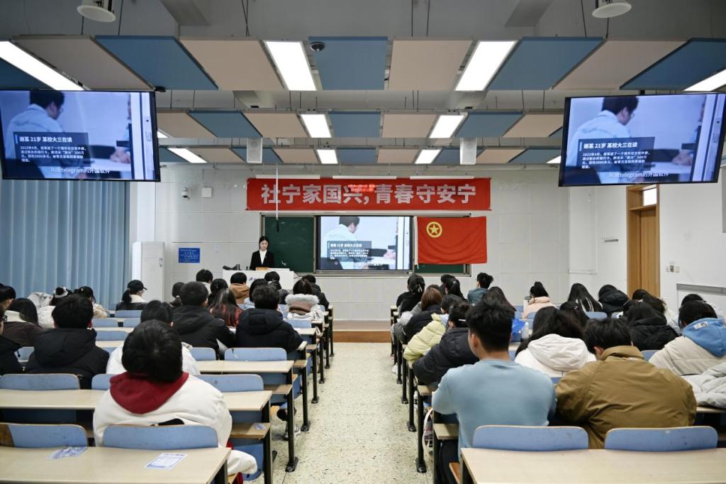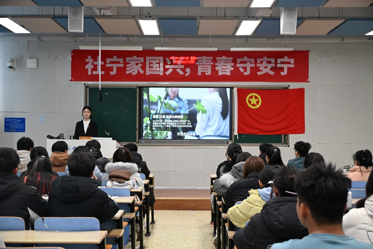 杨栩檬结合现场ppt生动形象的向大家分享了社会安全事例,聚焦日常“隐形风险”,以深夜独行、电动车防盗等贴近生活场景切入,让同学们深知安全隐患无处不在。同时,通过大学生出借“两卡”参与“跑分”刷单涉罪的真实案例,警示大家勿抱侥幸触碰法律红线,强化“安全无小事,习惯筑防线”的意识。