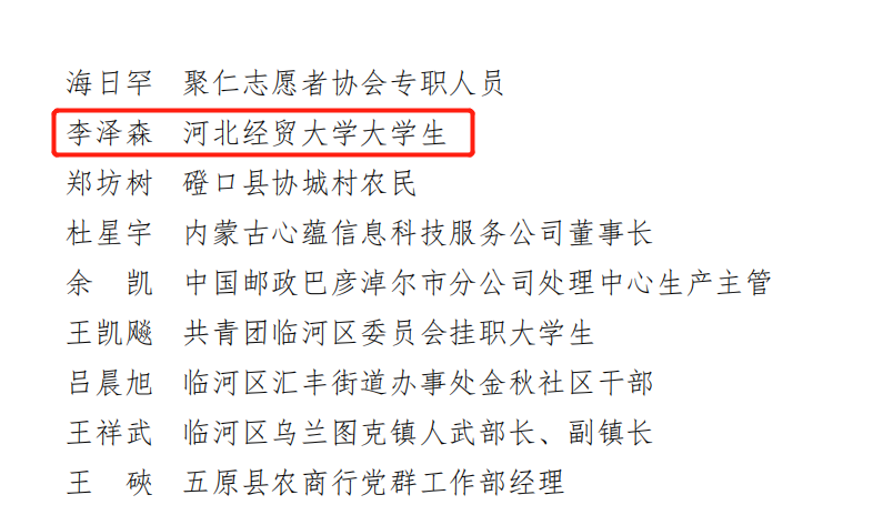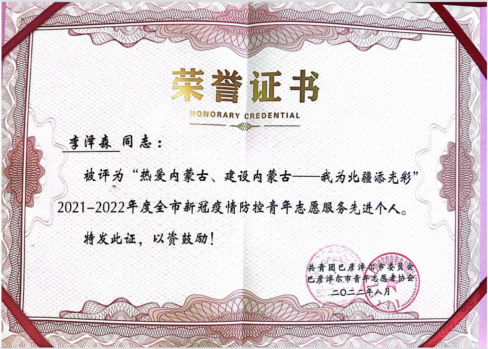 2022年暑假,内蒙古巴彦淖尔市突发本土新冠肺炎疫情,一场疫情防控阻击战就此打响。我院2021级统计学一班学生李泽森积极响应家乡疫情防控的号召,得知全员核酸检测消息后,在团市委的组织下主动向所在社区请缨,成为核酸检测志愿者。李泽森主要负责信息录入、秩序维护和入户统计查漏工作。他不畏任务艰巨,起早贪黑,全力投入疫情防控工作中,高标准、高效率、高质量完成了各项工作任务,总计工作时长40多天,服务时长315小时,服务居民3万人次,用实际行动诠释了抗疫志愿者的担当与责任。由于表现突出,被团市委、市青年志愿者协会授予“2021—2022年度新冠疫情防控青年志愿服务工作先进个人”荣誉称号。