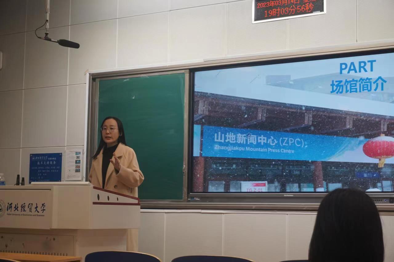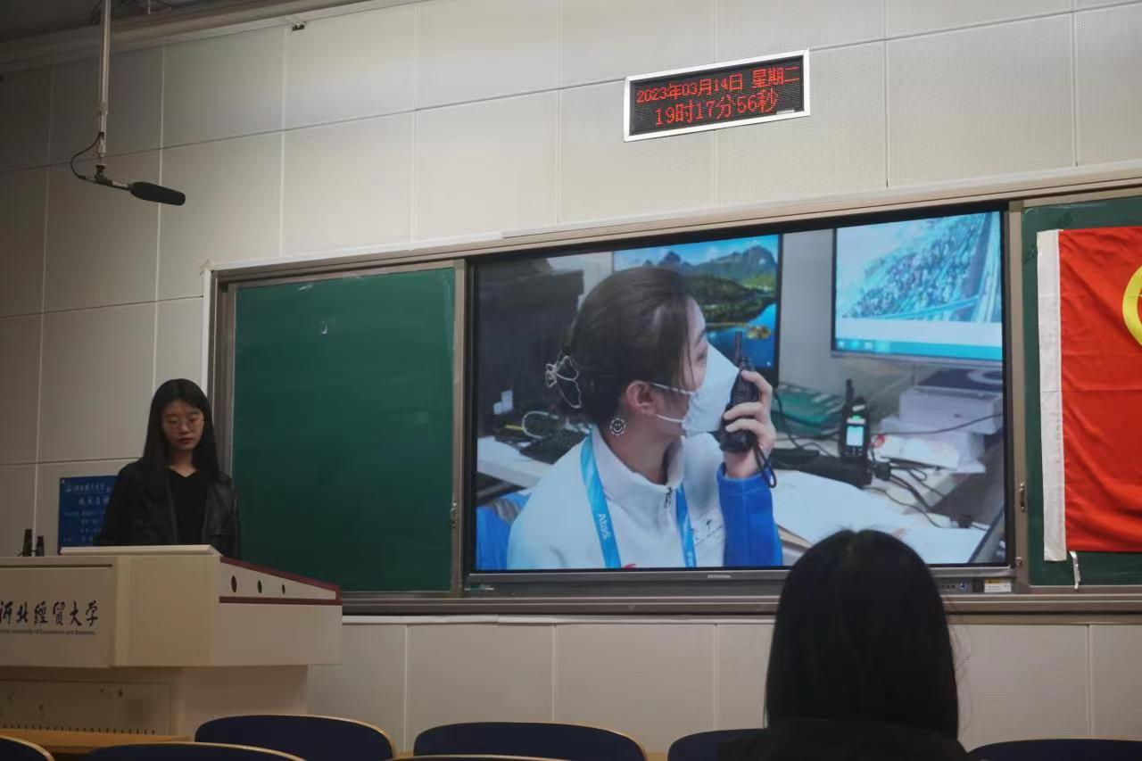 首先,由冯海云、蔡佳雨与大家分享有关冬奥志愿服务经历的心得感悟。宣讲内容从三方面展开:冬奥知识、志愿服务介绍与志愿服务感悟。2021年10月份,2022年北京冬奥会和冬残奥会志愿者招募工作基本完成,赛会志愿者培训工作全面展开,我院优秀志愿服务代表加入tyc33455cc太阳成集团志愿服务的队伍前往冬奥赛场。“我为加入志愿者的行列而开心快乐”冯海云同学回忆道,“在山地新闻中心的工作是一次特别的经历”。两位亲志愿者通过质朴的话语,使同学们更近一步知道了冬奥精神的内涵,什么叫“一身天霁蓝,一颗火热心”。