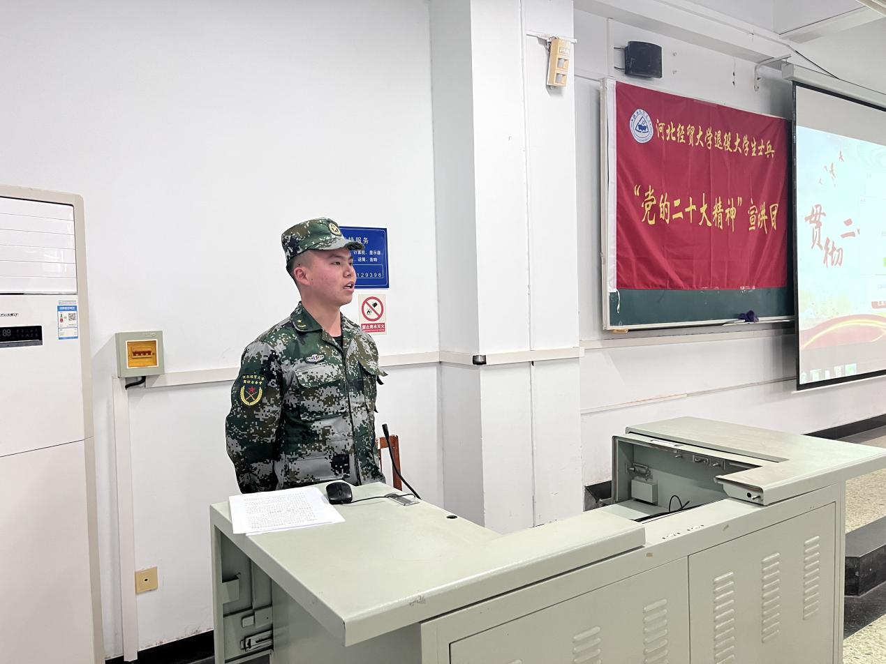 首先,张文婧从国家安全教育日设立背景、国家安全基本内容、国家安全重要性等方面进行阐述。国家安全人人有责,国家安全是安邦定国的重要基石,维护国家安全是全国各族人民的根本利益所在,我们要树牢总体国家安全观,感悟时代国家安全成就,同学们感悟颇深。接着,宣讲团成员黎秋君、范博文、宋光旭三位优秀大学生退役士兵依次进行宣讲。他们结合自身经历和身边真实故事对二十大精神进行深刻阐释,从自主支配自己的生活到一切行动听指挥,他们都表示两年的军营生活让自己不仅得到了锻炼,也收获了知识和深厚的战友情,“当兵后悔两年,不当兵后悔一辈子”,部队的经历成了他们一生中最珍贵的记忆。最后,张文婧召开大家作为新时代的青年,应该紧跟党的步伐、积极响应党的号召,发挥青年的积极性和创造性,让青年无悔于这个伟大的时代。