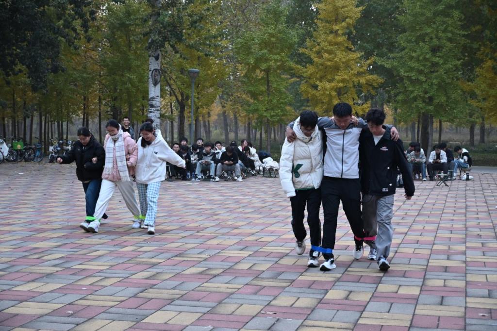 在“三人四足”中,比赛开始前,一个班级的两队在面对面两条线后准备,不得抢跑。发令后,两人配合前进,尽快完成规定路程并与对面队友交接。若绳子脱落,需原地重绑再前进。有人摔倒可重新站起继续或放弃。
