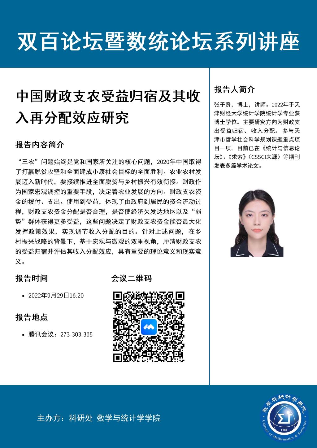 张子贤,博士,讲师。2022年于天津财经大学统计学院统计学专业获博士学位。主要研究方向为财政支出受益归宿、收入分配。参与天津市哲学社会科学规划课题重点项目一项。目前已在《统计与信息论坛》、《求索》(CSSCI来源)等期刊发表多篇学术论文。