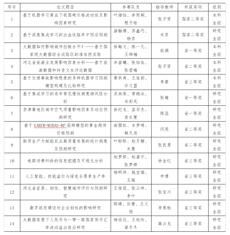 2024年(第十届)全国大学生统计建模大赛自2月开赛以来,全国共有21386支队伍提交论文参赛,评出604支队伍入围国赛,经国赛通讯评审、现场会议评审和现场答辩赛角逐,最终评选出一等奖60支,二等奖119支,三等奖408支。我校共有32支队伍参赛,其中本科生组11支队伍,研究生组21支队伍,最终本科生组获得国家二等奖1项、省级一等奖1项、省级二等奖1项、省级三等奖1项,研究生组获得国家二等奖1项、省级一等奖2项、省级二等奖2项、省级三等奖5项,获奖名单如下: