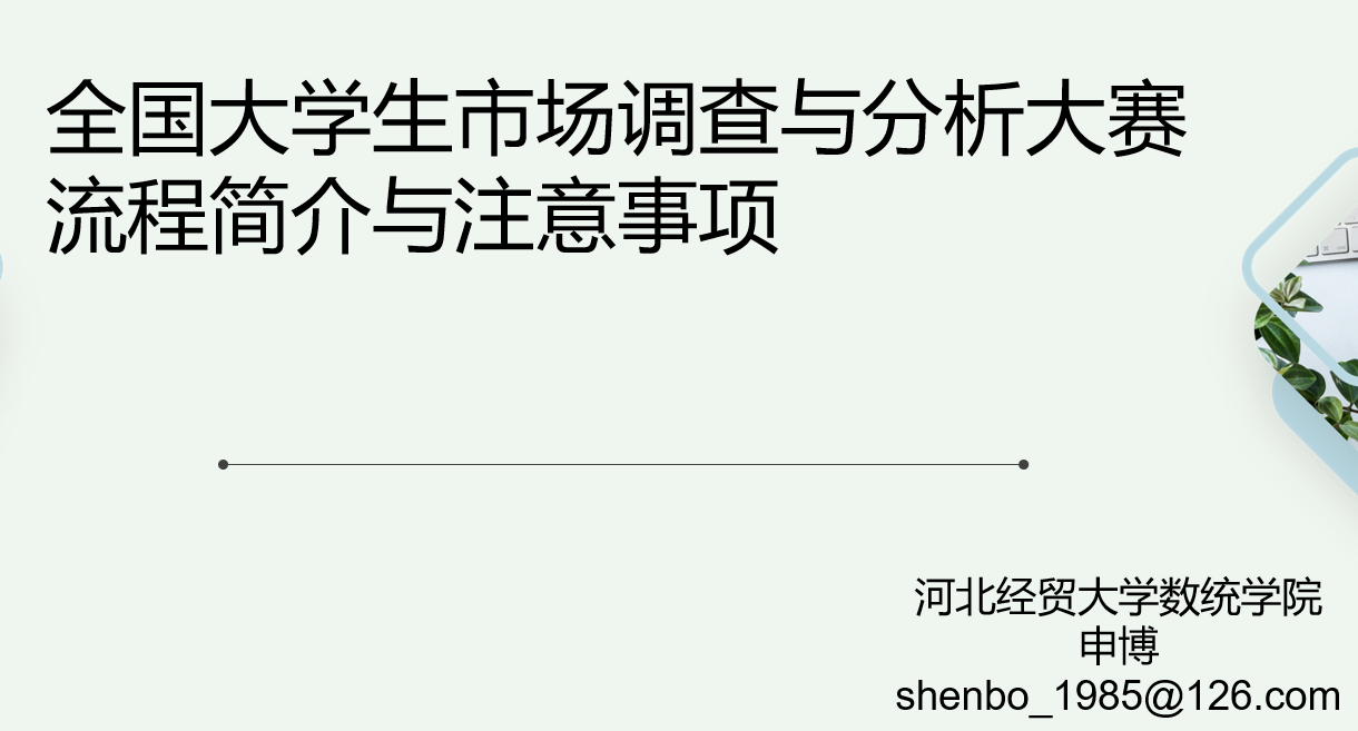 申博从指导教师和学生协作的角度分享了参与市场调查大赛的一些心得。一是全国大学生市场调查与分析大赛简介,具体包括大赛的组织机构、层次规模、大赛历史几个方面,介绍了全国大学生市场调查与分析大赛的基本情况;二是参赛流程以及赛前准备,详细给各位老师和同学介绍了自报名组队之日起,中间每个阶段需要完成的任务及注意事项,并就其中一些关键的统计术语进行了直观解释。