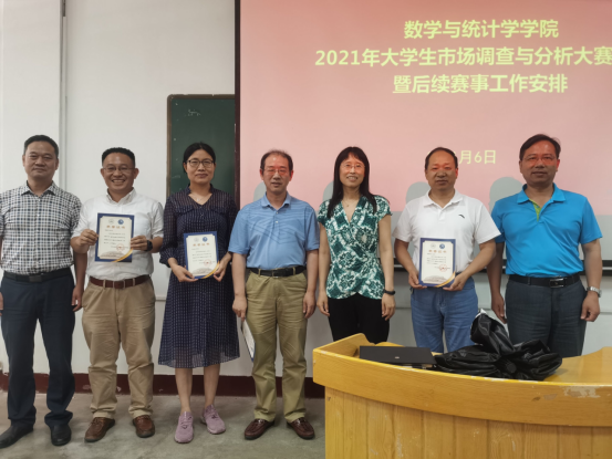 2021年6月17日下午16:00,在祃海霞书记的主持下,我院在二教106举办了关于大学生市场调查与分析大赛的表彰会。李春林、马银戌、鲁勇兵、徐金红等几位教师从学院第一次组织参赛、学院第一次承办省赛,就全身心投入,付出了很多心血,取得了历届的优异成绩,经学院党委研究,决定为4位老师授予“数学与统计学学院市场调查与分析大赛突出贡献奖”,以示鼓励。